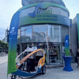 Im Rahmen der Frankfurter Fahrradmesse EUROBIKE 2022 war Velotaxi im Auftrag von DB Vertrieb und DB Connect mit zwei e-mobilen, im DB Look gebrandeten Velo-BRING Lastenrädern im Einsatz. Der klimafreundliche Gepäckservice ermöglichte es den DB Geschäftskunden, ihr Gepäck direkt am Infocounter im Frankfurter Hauptbahnhof abzugeben und bequem zu ihrem Hotel transportieren zu lassen – ein praktischer Service für einen unbeschwerten Messebesuch.