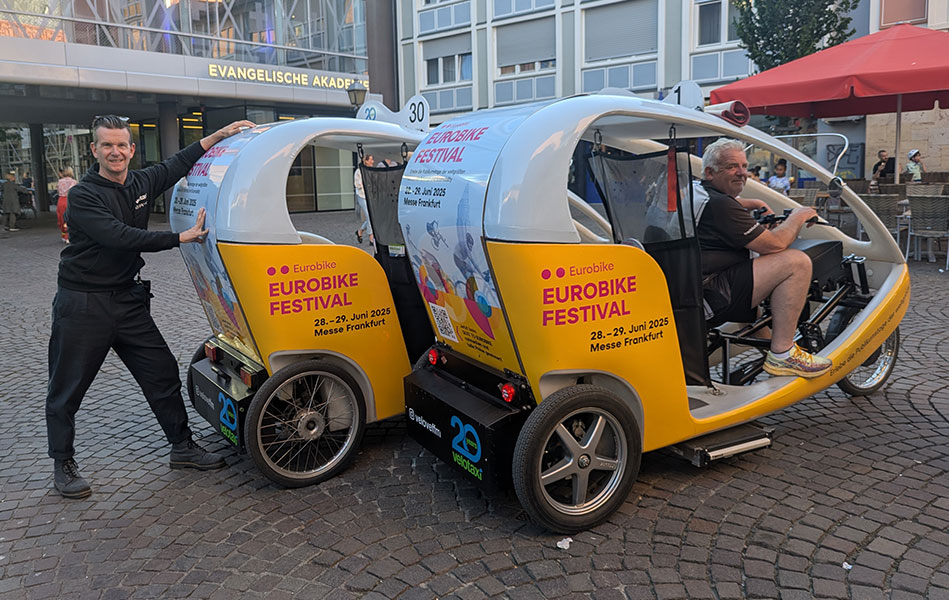 Auch in den Jahren nach 2022 war Velotaxi wiederholt für die EUROBIKE im Einsatz. Jeweils zwei auffällig im Messe-Design gebrandete Velotaxis waren im Stadtgebiet unterwegs, um die Messe publikumswirksam zu bewerben und Besucher:innen auf umweltfreundliche Weise zu befördern.